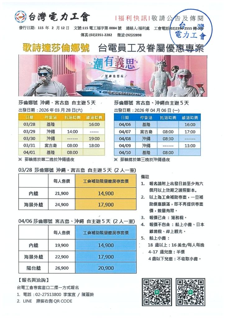 歌詩達莎倫娜號-台電優惠專案 2026年 02月 12日 tplu 福利處, 福利專區 歌詩達莎倫娜號-台電優惠專案 已關閉迴響。 11502112福利快訊-歌詩達莎倫娜號下載 分享此文: 分享至 LINE(在新視窗中開啟) LINE Tweet 以電子郵件將連結傳送給朋友(在新視窗中開啟) 電子郵件 相關