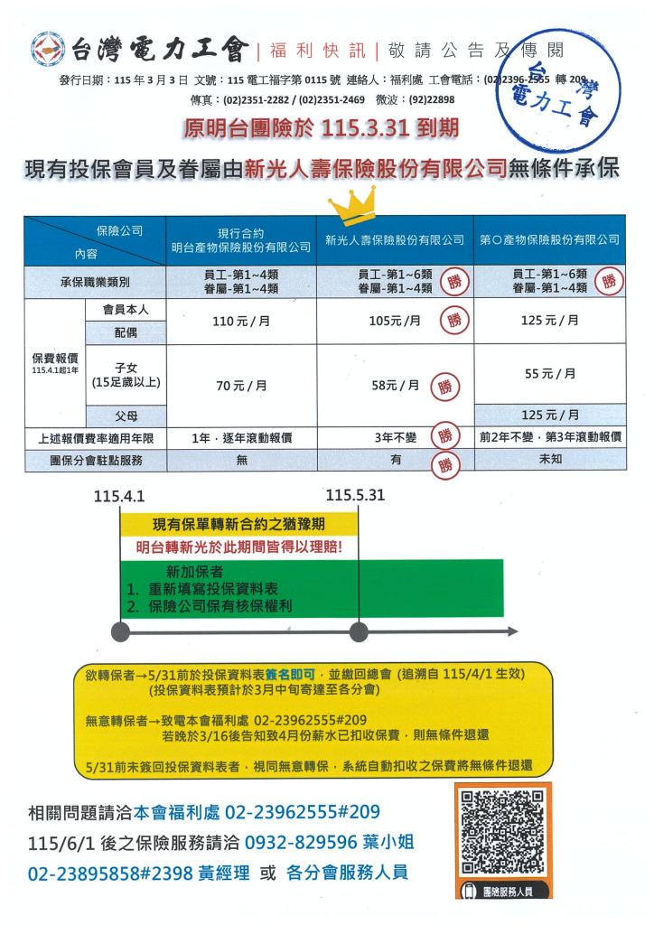 原明台團險115.03.31到期將由新光人壽保險股份有限公司無條件承保 2026年 03月 3日 tplu 福利處, 福利專區 原明台團險115.03.31到期將由新光人壽保險股份有限公司無條件承保 已關閉迴響。 1150303福利快訊-明台團險轉新光團險下載 分享此文: 分享至 LINE(在新視窗中開啟) LINE Tweet 以電子郵件將連結傳送給朋友(在新視窗中開啟) 電子郵件 相關