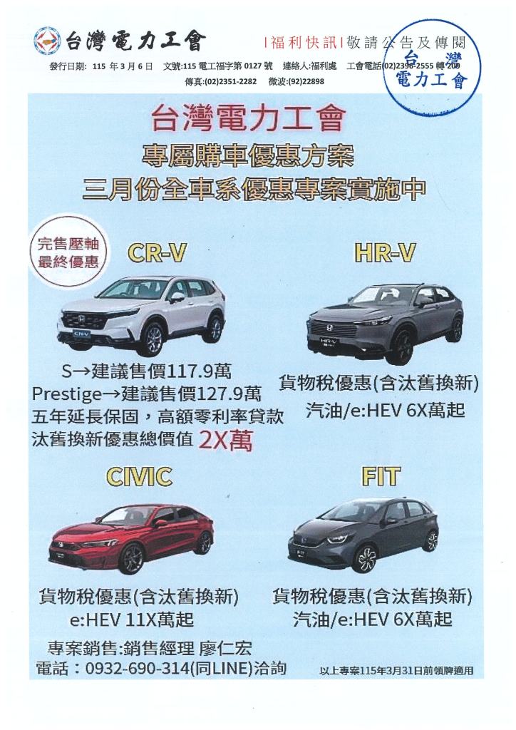 HONDA 台電員工購車優惠專案 2026年 03月 6日 tplu 福利處, 福利專區 HONDA 台電員工購車優惠專案 已關閉迴響。 20260306082349下載 分享此文: 分享至 LINE(在新視窗中開啟) LINE Tweet 以電子郵件將連結傳送給朋友(在新視窗中開啟) 電子郵件 相關