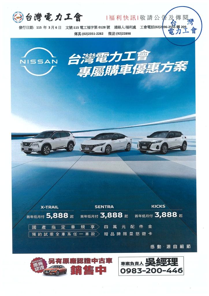 NISSAN 台電員工專屬購車優惠專案 2026年 03月 6日 tplu 福利處, 福利專區 NISSAN 台電員工專屬購車優惠專案 已關閉迴響。 20260306082419下載 分享此文: 分享至 LINE(在新視窗中開啟) LINE Tweet 以電子郵件將連結傳送給朋友(在新視窗中開啟) 電子郵件 相關