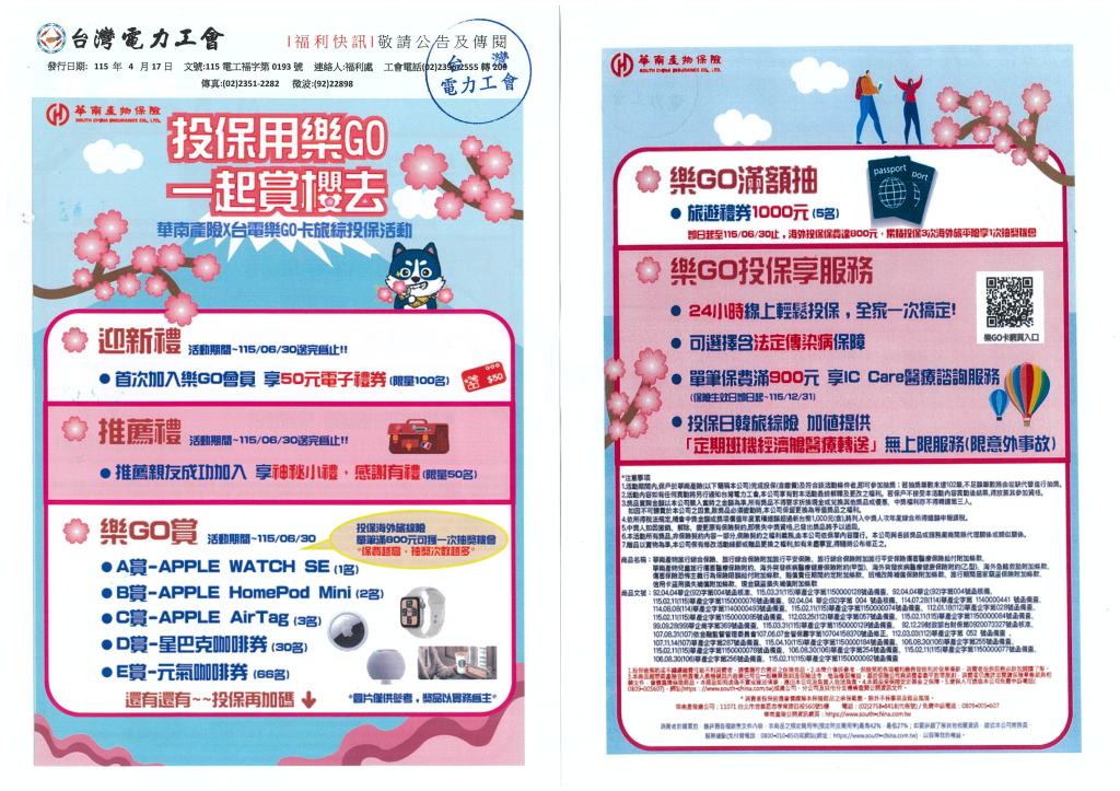 華南產險X投保用樂GO一起賞櫻去 2026年 04月 17日 tplu 福利處, 福利專區 華南產險X投保用樂GO一起賞櫻去 已關閉迴響。 20260417112240下載 分享此文: 分享至 LINE(在新視窗中開啟) LINE Tweet 以電子郵件將連結傳送給朋友(在新視窗中開啟) 電子郵件 相關